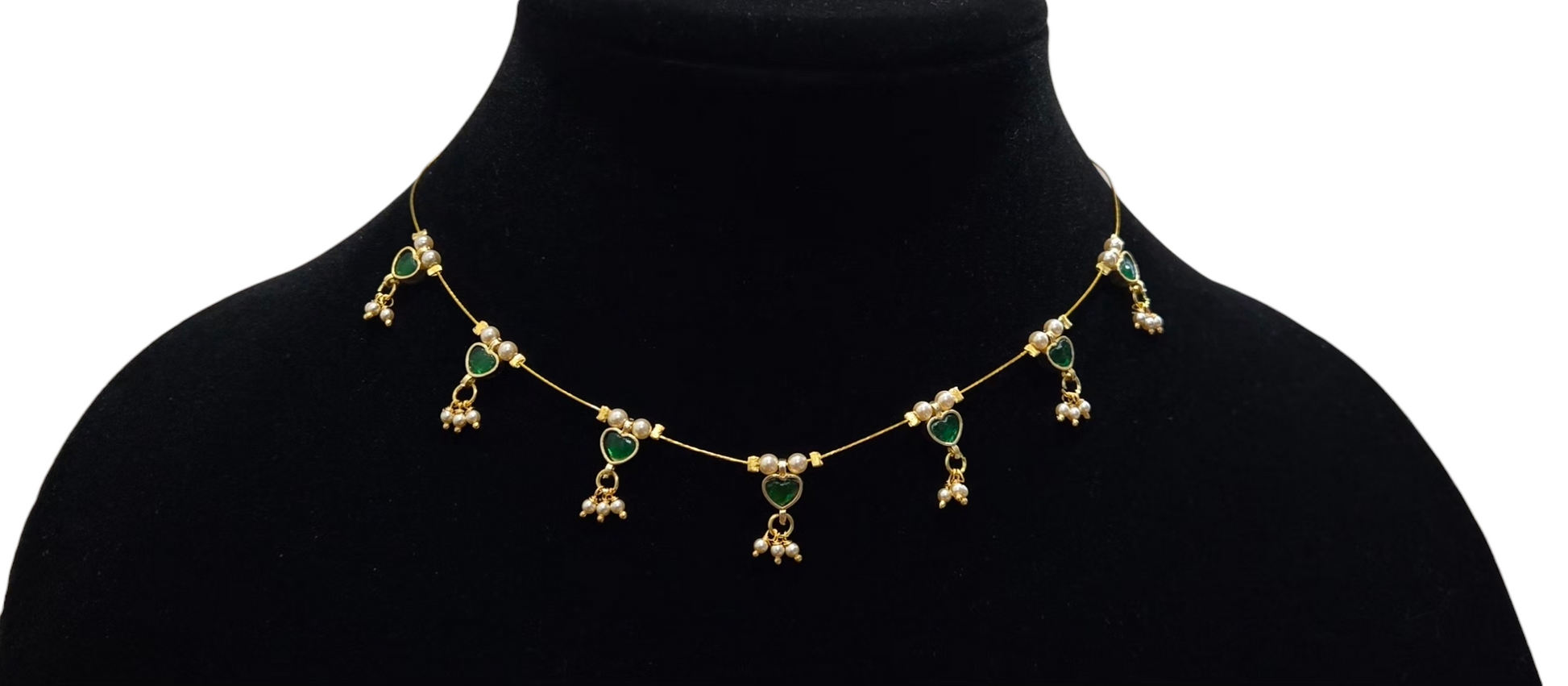 A celebration of timeless beauty, this handcrafted gold necklace features radiant pink or green heart-shaped jadav pendents nestled in ornate gold settings. Each pendant is flanked by luminous swarowski pearls and finished with small swarowski pearl clusters. Designed for ceremonial elegance and festive grandeur, it’s a piece that speaks of heritage, craftsmanship, and refined romance.