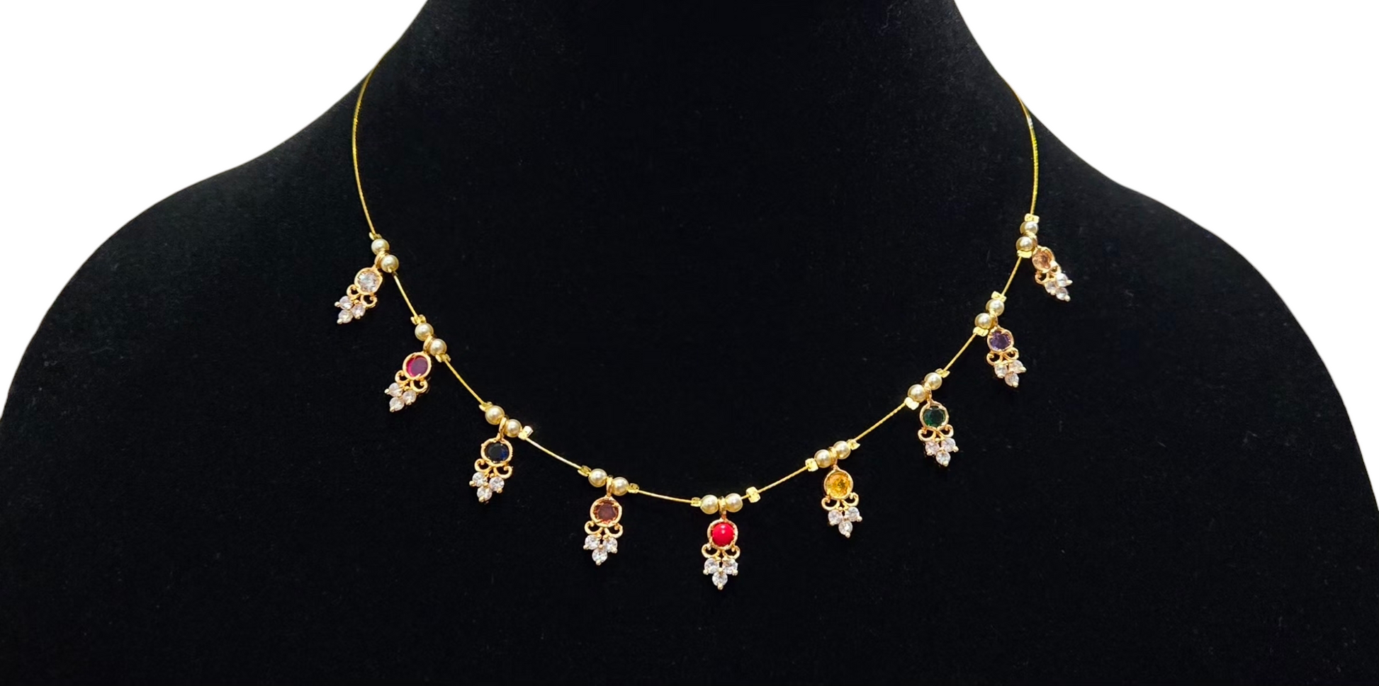 Celebrate vibrant elegance with this handcrafted gold necklace, adorned with a cascade of colorful gemstone pendants.